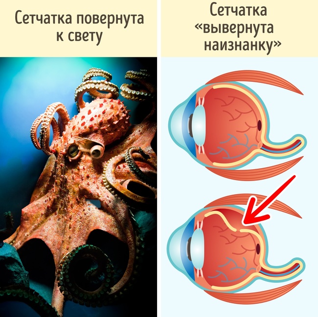 - Як було б краще? У багатьох представників тваринного світу структура очі влаштована інакше. Наприклад, у сітківці кальмарів і восьминогів фоторецепторні клітини повернені до джерела світла, що робить пристрій їхніх очей куди «логічніше», ніж у людини. Так що варто взяти з них приклад — просто перевернути сітківку.