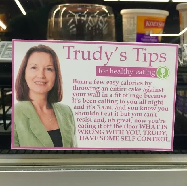 «Рада по здоровому харчуванню від Труді. Спаліть з легкістю небагато калорій, в нападі люті кинувши торт у стіну, тому що він вабив вас всю ніч, і вже 3 години ночі, і ви знаєте, що не варто його є, але не можете чинити опір, і ох, ну відмінно, тепер ти їси його прямо з підлоги, ЩО З ТОБОЮ НЕ ТАК, ТРУДІ, МАЙ ХОЧ КРАПЛЮ САМОКОНТРОЛЮ».