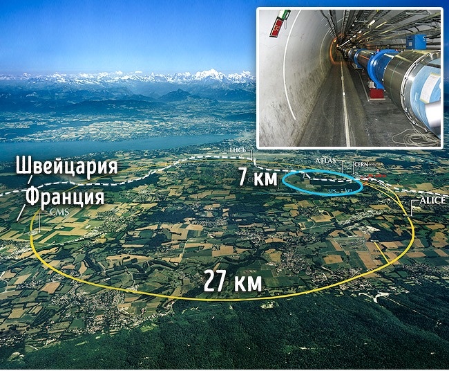 Найбільша експериментальна установка в світі знаходиться поруч з Женевою, на кордоні Швейцарії та Франції. З висоти адронний коллайдер не побачити, так як знаходиться він під землею.