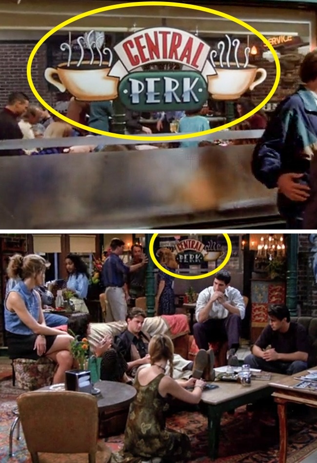 Як ви розумієте, всередині напис з назвою улюбленого кафе повинна відображатися навпаки. Але і всередині, і зовні вона виглядає однаково. Якщо наклейки з двох сторін, то не збігається малюнок цівок пари. А ще з вулиці здається, що всередині немає на місці знаменитого дивана.