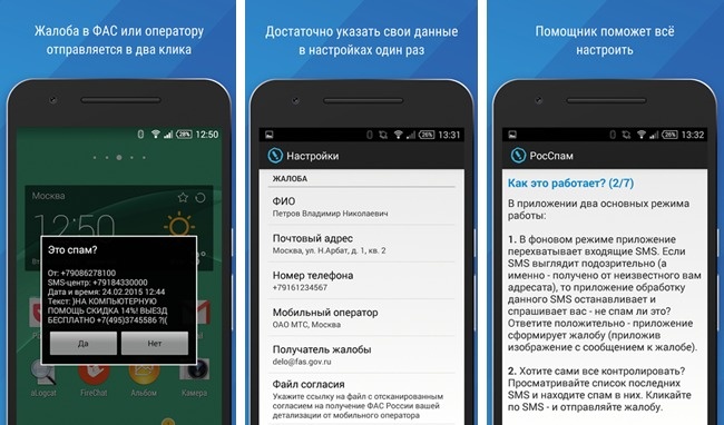 Завдяки додатком «РосСпам» можна відправити скаргу безпосередньо у ФАС і убезпечити себе від спамерів, які вже в базі «РосСпама». Скачайте додаток, після установки заповніть анкету і дозвольте додатком обробляти дані. Тепер будь спам-повідомлення з вашого схвалення буде трансформовано в скаргу, яка автоматично відправиться в ФАС.