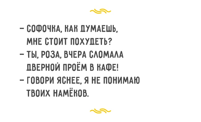 — Хаечка, таки коли ти йдеш в магазин за новою взуттям, так ти шо, йдеш босоніж?! - — Ой, Циля! 15 років не бачилися! Ти так розтовстіла, шо тебе й не впізнати!
