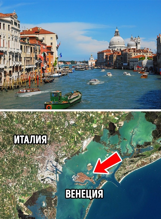 Багато хто думає, що Венеція — це просто місто з безліччю каналів. Насправді це місто-острів (якщо не брати в розрахунок материкову частину). Швидше за все, таким дивним розташуванням Венеція зобов'язана тим, що її просто колись затопило. Подивіться на Гранд-канал — він схожий на затоплений проспект.