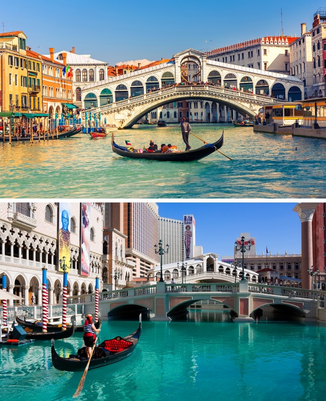 У Лас-Вегасі, США, в 1999 році відкрилося казино «Венеція». Навколо нього були побудовані мости, будинки і канали, в яких плавали гондоли з гондольєрами. Деякі навіть говорять, що в американській Венеції їм сподобалося більше. До речі, справжня «королева Адріатики» зображена на фото зверху.