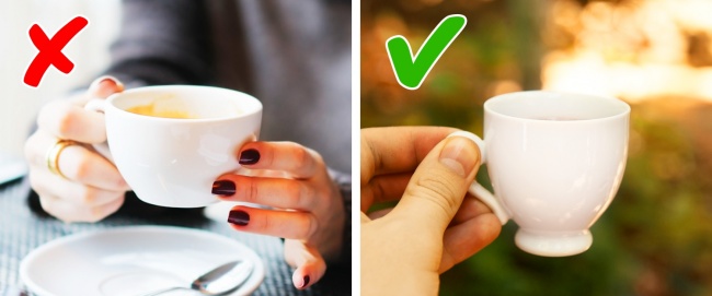 Всі ми знаємо, яку увагу приділяється у Великобританії чаювання. І щоб усе було дійсно на найвищому рівні, потрібно знати, як правильно тримати чашку. Цікаво, що палець в ручку вставляти не можна. Чашку зверху потрібно підтримувати великим і вказівним пальцем, а знизу — середнім. Ні в якому разі не можна відстовбурчують мізинець.