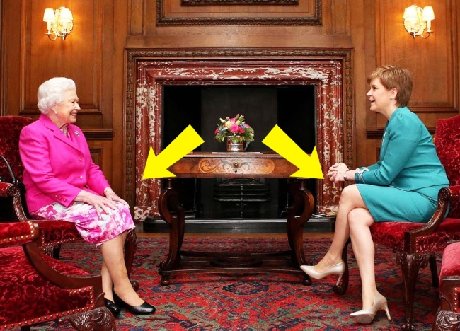 Жінкам з королівської родини не можна сидіти як їм захочеться. Не можна закидати ногу на ногу. Правильне положення ніг — з сполученими колінами. Також можна схрестити щиколотки і трохи нахилити коліна в бік.