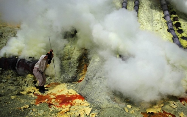 Вулкан Кава Іджен розташований на острові Ява, його висота становить 2 600 м. В жерлі вулкана розташоване яблучно-смарагдового кольору озеро, яке складається з сірчаної і соляної кислот. Робітники — місцеві жителі без будь-яких захисних костюмів і протигазів (а вдихати запах сірки то ще відраза), добувають шматки сірки день і ніч, використовуючи при цьому лише свої нічим не захищені руки і хустку, зав'язану на особі для захисту рота і носа. Денна виручка становить менше $ 5 на людину.