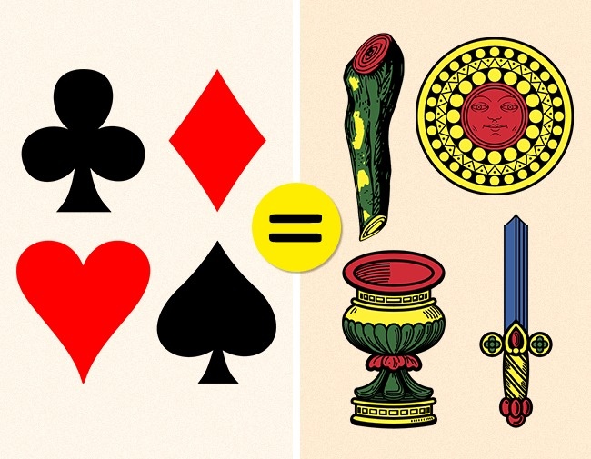 Масті — це не що інше, як стилізовані зображення певних предметів: піки — це мечі, черви — кубки, трефи — жезли або дубини, а бубни — монети.