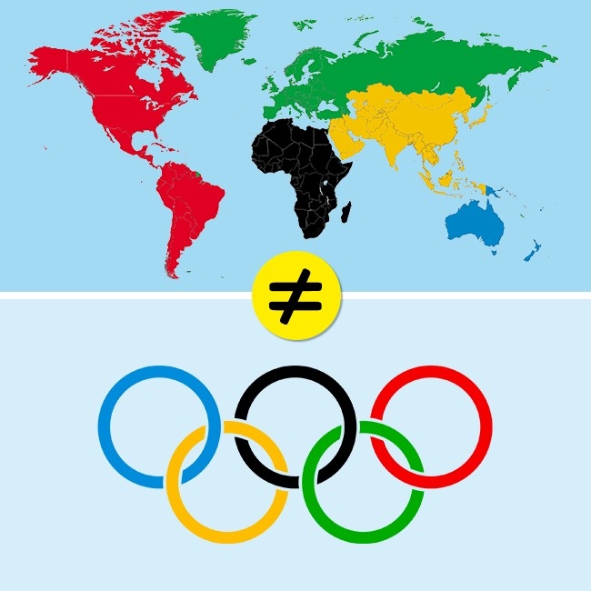 Відомо, що кольорові олімпійські кільця символізують 5 континентів: жовтий — Азію, червоний — Америку, чорний — Африку, а блакитний і зелений — Австралію і Європу.