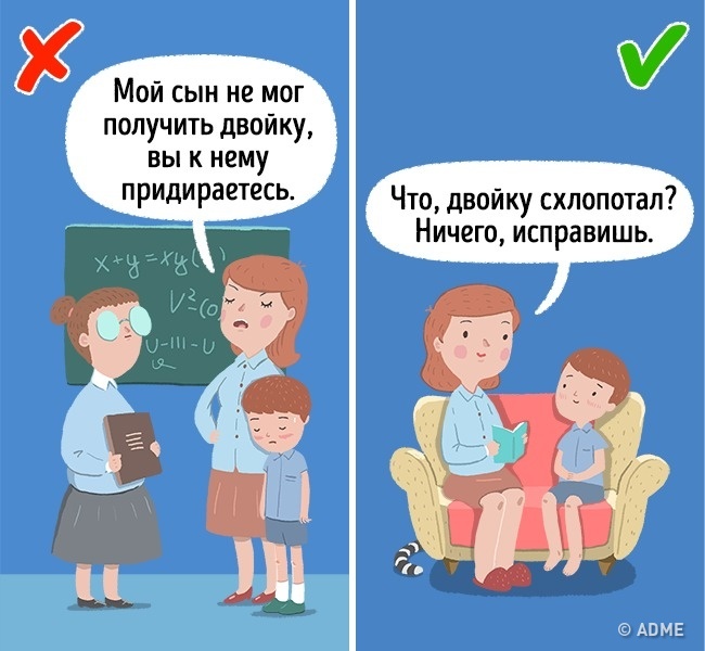 Заступитися за дитину перед вчителем або шкільним хуліганом — природне бажання батьків. Однак дитині це здається вторгненням в особисте життя і навіть неповагою, адже ви б ні за що не кинулися так само захищати дорослого. Тому перед тим як допомагати, запитайте дитину, а чи потрібна йому ця допомога. Інакше йому буде дуже ніяково.