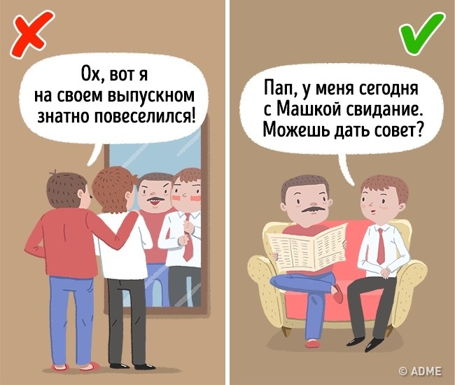 Що особливо дратує хлопців, так це постійні розповіді про їх дитячих промахах. Перша любов у 3 роки, спроби відмовитися від ложки на користь їжі руками — це історії, які потрібно зберігати, а не розповідати. Якщо сумніваєтеся, чи варто говорити про що-то, краще поставте себе на місце дитини — як вам було б незручно.