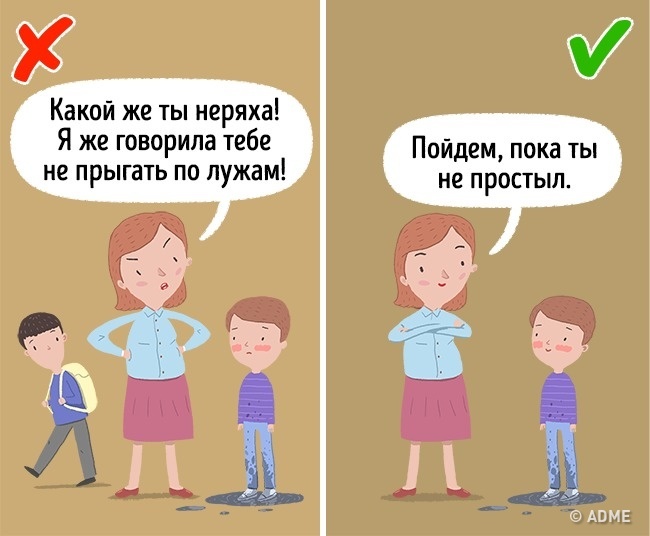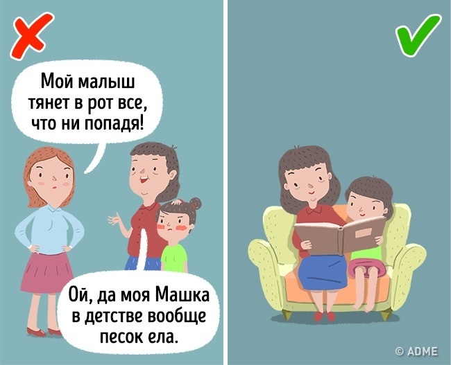 У присутності інших людей не варто проявляти не тільки зайву турботу, але і невдоволення поведінкою дитини. Зауваження краще висловлювати будинку. Адже для дітей це означає, що ви раніше не ставтеся до них серйозно, як до дорослих. І це правда — подумайте, сказали б ви таке сверстнику, та ще й прилюдно? Але найголовніше, це змушує дитину соромитися вас.