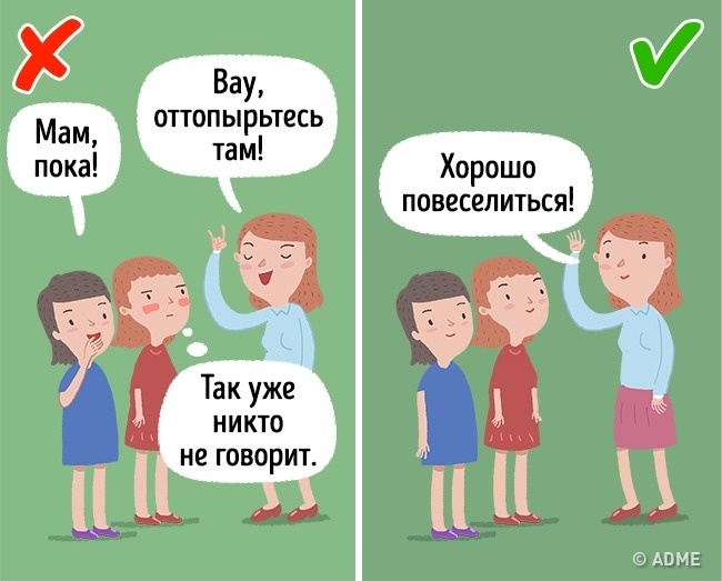 Пристойна начебто жінка в міні-спідниці і з карамельно-рожевою помадою або серйозний чоловік у бейсболці, через який вставляє слово «йо», — нерозумно навіть з точки зору дорослих. Для наших чад ж такі спроби омолодитися і зовсім здаються смертним гріхом, заслуговує самої страшної кари, — глузувань. Ви напевно не бажаєте дітям такої долі, так що відповідають своєму статусу, але при цьому залишайтеся собою в будь-якій ситуації і компанії.