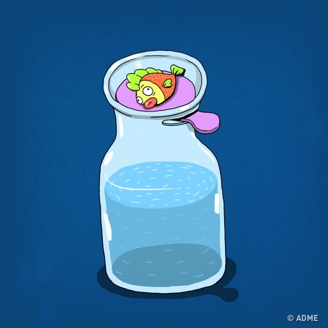 Фокус: Ілюзіоніст показує публіці закриту кришкою пляшку з водою. Накриває її хусткою, промовляє чарівні слова і, коли хустка піднімається, в пляшці виявляється маленька жива рибка.
