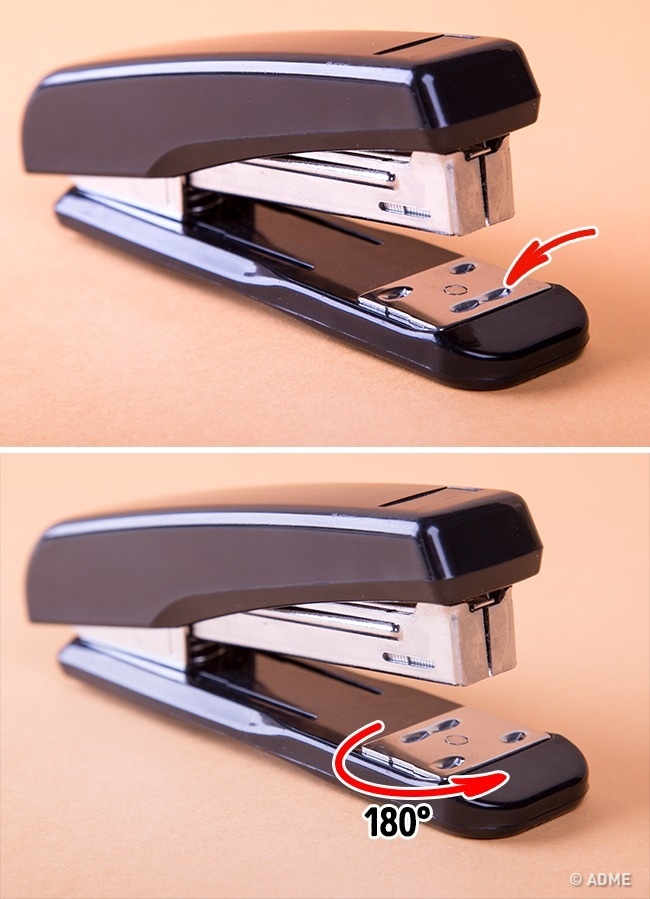 Дуже зручна функція, якій ми не знаємо і не користуємося. Платформу на нижній частині степлера, яка загинає скоби, можна перевернути на 180 градусів. І тоді кінці скоб будуть загинатися назовні, а не всередину — це зручно, якщо ви скріплює листи тимчасово.