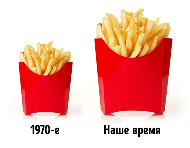 Цікаво, що за останні 40 років стандартна порція картоплі фрі зросла в 2 рази. Виробники інших продуктів теж непомітно збільшують розмір порції і її ціну. А значить, ми з вами теж споживаємо більше, хоч і не здогадуємося про це.