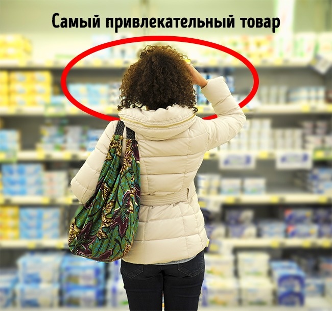 Оскільки основна частина покупців — правші, на полицях справа завжди знаходяться товари імпульсивного попиту. Їх ми купуємо по ходу, не дивлячись, а магазин отримує додаткові продажу.