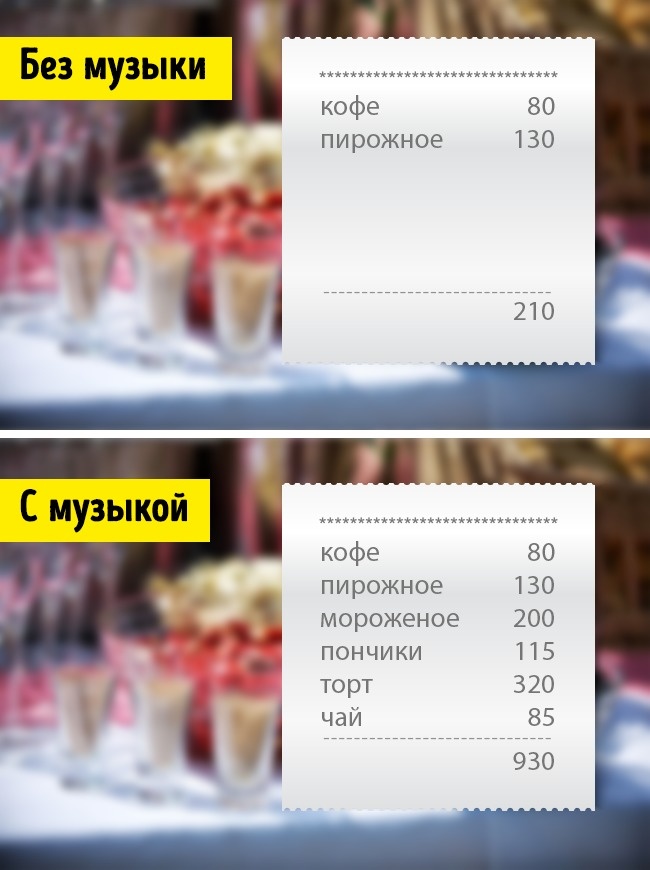 Як ви думаєте, чому в ресторанах грає класика? Вчені з'ясували, що вона «допомагає» відпочиваючому в ресторані витратити на 10 % більше грошей на їжу, ніж якщо б довелося обідати в тиші.