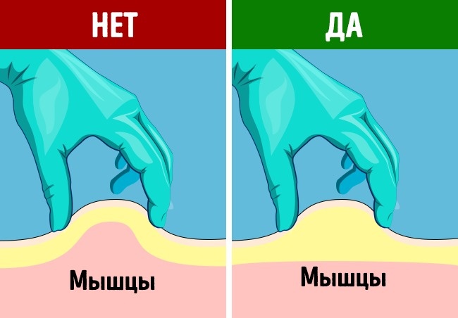 - Якщо вам складно потрапити в потрібне місце або ви дуже худий, сформуйте рукою складки на стегні і коліті в неї. Прослідкуйте, щоб в складці виявився тільки жир, а не м'язи.