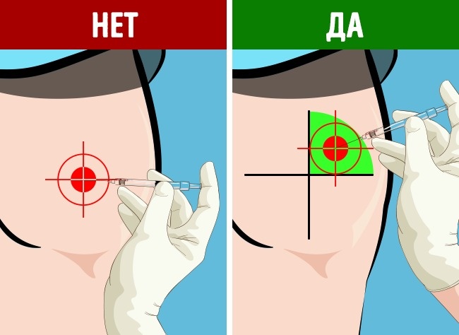 - На сідниці того, кому ви будете робити укол, подумки намалюйте великий хрест, що розділяє її на 4 частини. Коліті у верхню зовнішню частину, так ви точно не потрапите в нерв.