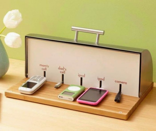 Чудова ідея, як з непотрібної хлібниці зробити витончене пристосування. І проблема валяються проводів вирішена.