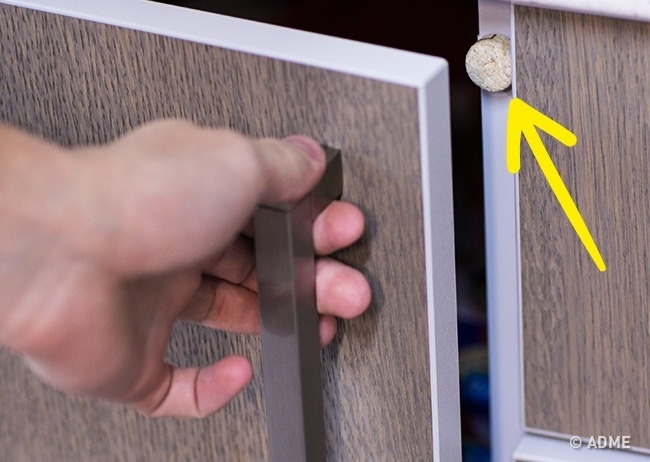 Якщо дверцята шафки постійно закривається надміру голосно, прикріпіть у куточок шматочок винної пробки. Це зробить удар безшумним.