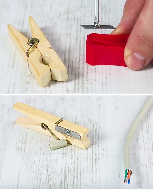 Якщо під рукою немає потрібного інструменту, то зняти ізоляцію з дроту допоможуть точилка для олівців і звичайна прищіпка.