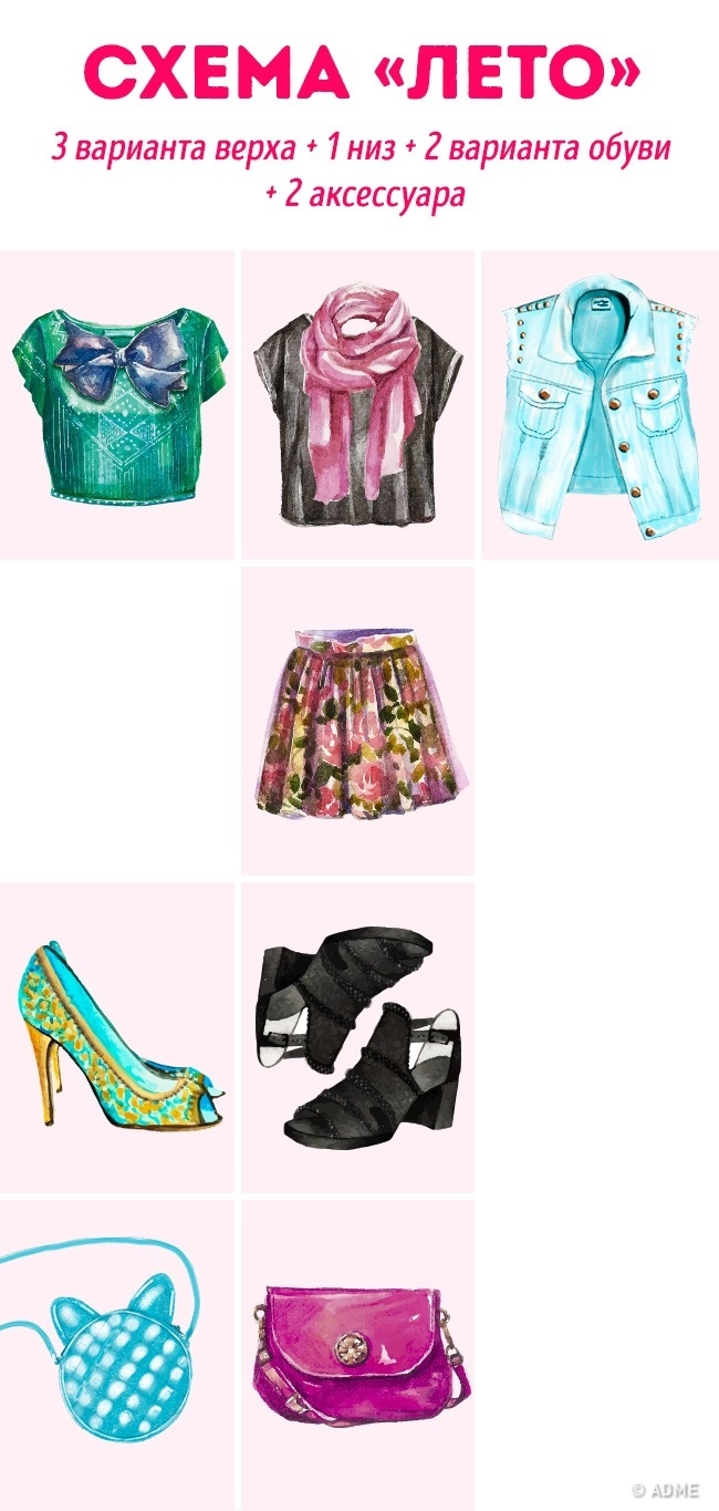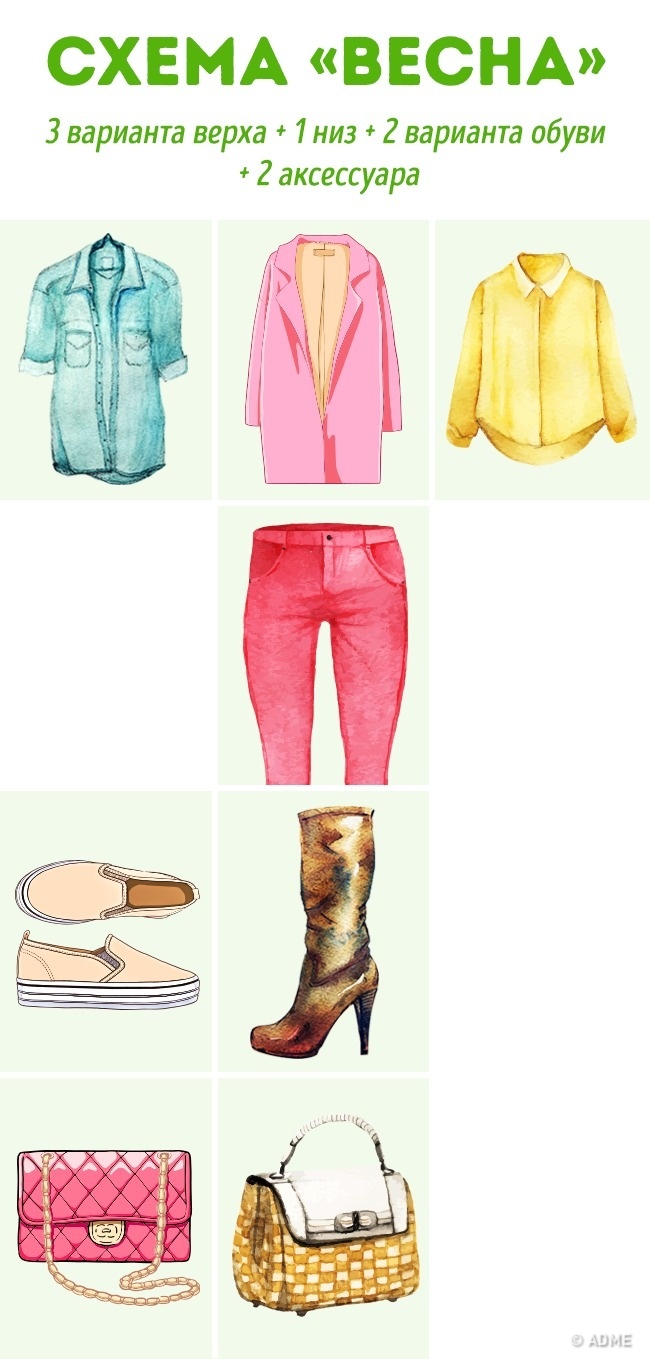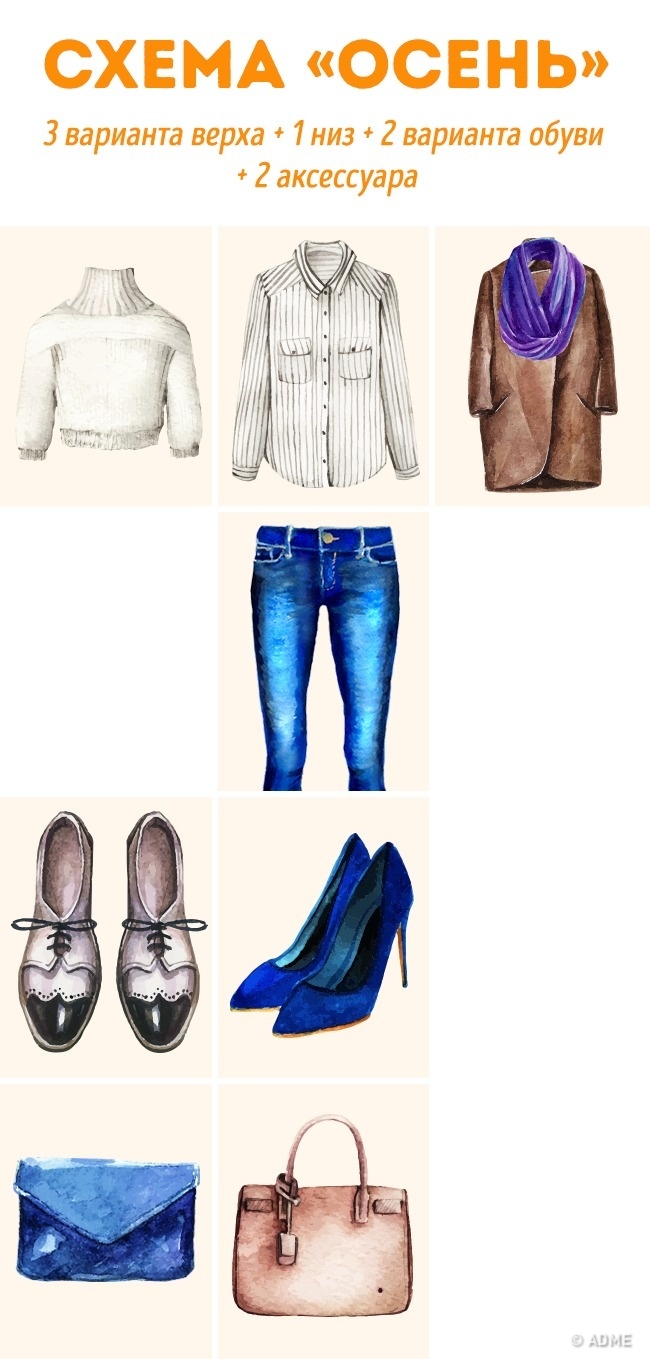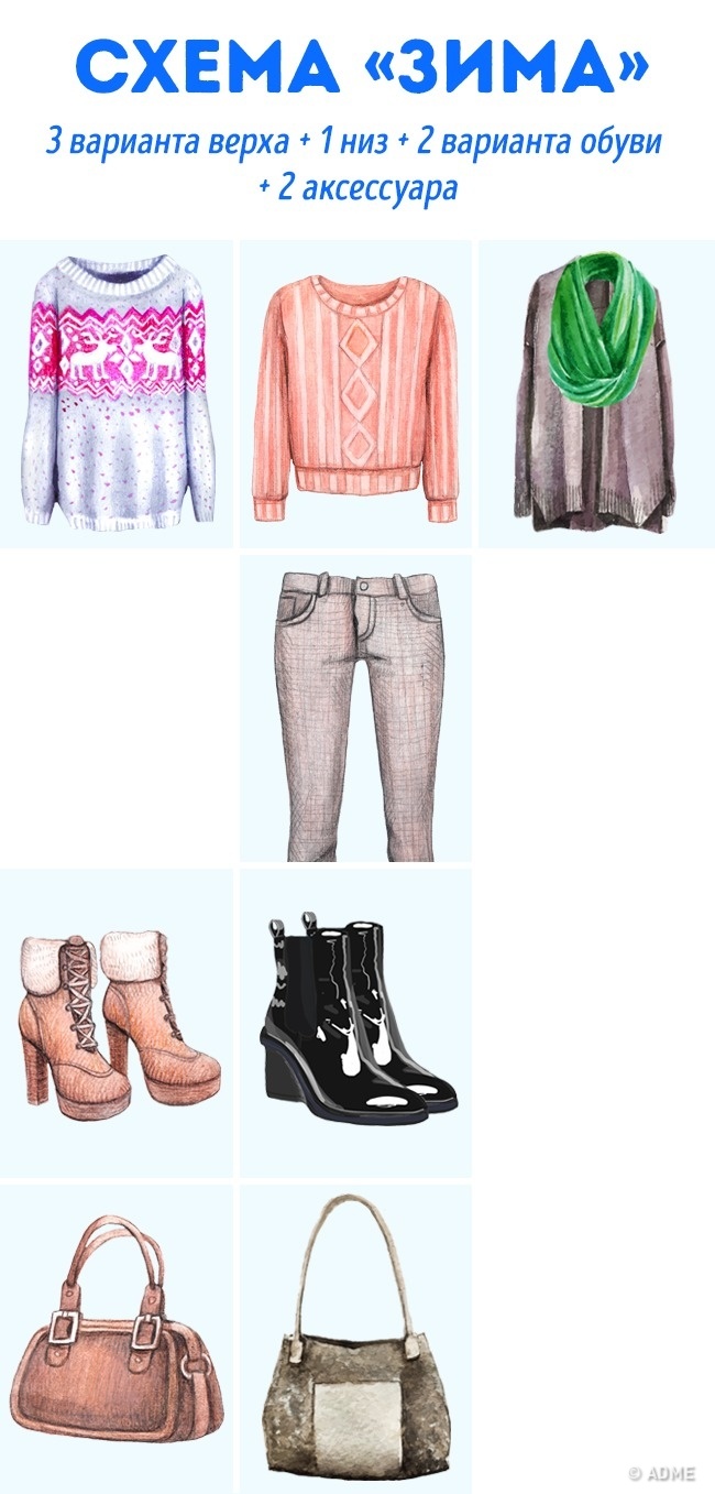 1 комплект = 1 низ (спідниці, брюки, сукні) + 2-3 варіанти верху (свитшоты, кардигани, пальто і т. д.) + 2-3 варіанти взуття (чоботи, ботильйони, чоботи і т. д.) + сумка (аксесуари).