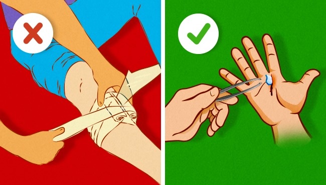 Чому неправильно: Можна дістати скалку з пальця або невеликий скляний осколок з руки, але ніколи не виймайте предмети з серйозної рани. Лікарі притримують сторонні речі на місці, поки потерпілий не виявиться в операційній. В іншому випадку нічим буде зупинити кровотечу, яке відкриється після вилучення предмета і компенсувати крововтрату.