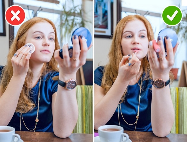 - Ви можете нафарбувати губи помадою прямо за столом, проте використовувати туш або пудру потрібно тільки в туалеті.