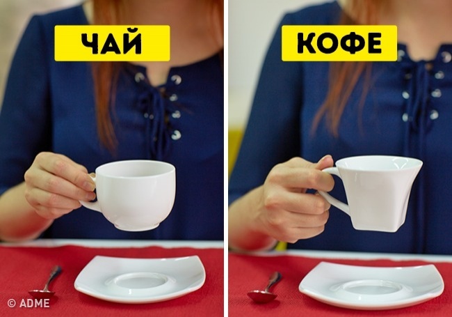 - Чашку з чаєм слід тримати, стискаючи ручку пальцями. Чашку з кавою можна тримати, «заклавши» палець за ручку.