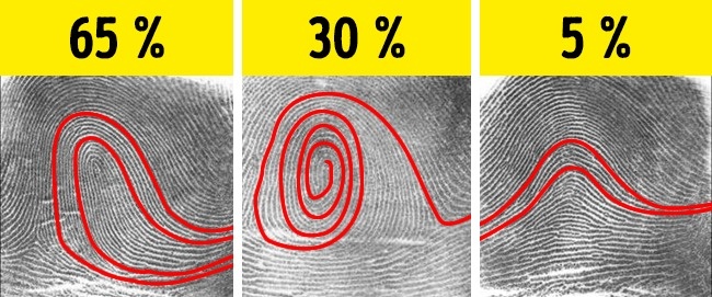 Тільки 5 % людей мають відбитки пальців у вигляді арок (65 % — у вигляді петель, 30 % — у вигляді завитків).