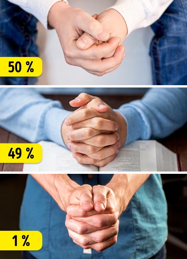 Складіть руки в замок і подивіться на стан великих пальців: у 50 % людей палець правої руки закриває палець лівої, а у 49 % — навпаки. І лише у 1 % людей пальці в такому положенні знаходяться поруч.