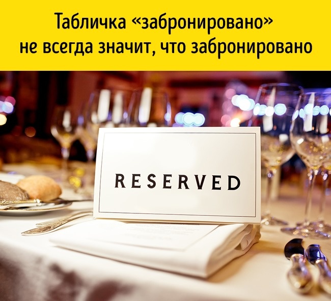 Ви ніколи не помічали, що практично в будь-якому ресторані на всіх самих класних і великих столах стоїть табличка Reserved? Насправді вони не завжди зайняті, а просто перебувають «в режимі очікування», щоб яка-небудь парочка мимовільно не сіла за величезний стіл, за який можна посадити велику компанію і отримати більшу виручку.