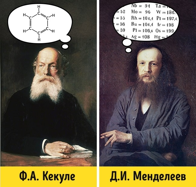Всім відомий приклад Дмитра Менделєєва, який бився над створенням періодичної системи і одного разу побачив її уві сні. Схожа історія сталася з хіміком Кекуле — йому уві сні з'явилася формула бензолу.