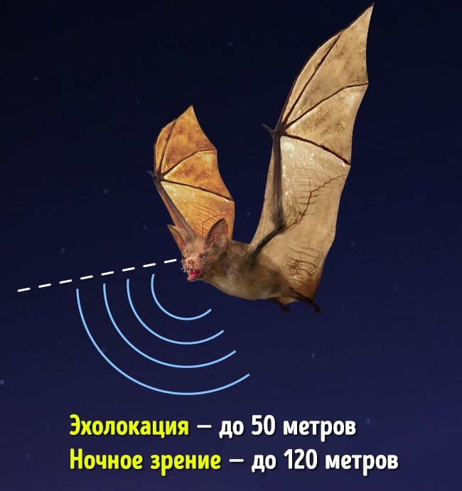 Насправді: хоча для орієнтації в просторі кажани використовують ехолокацію, при певному рівні освітлення миші орієнтуються за допомогою зору.
