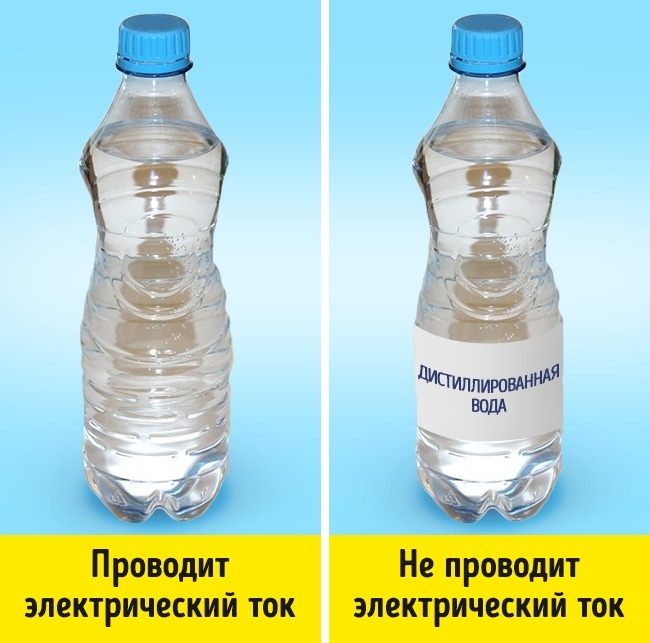 Насправді: електрика проводять розчинені у воді мінерали з позитивно і негативно зарядженими частинками, а самі по собі молекули води заряду не мають. Тому дистильована вода із-за відсутності в ній домішок струм не проводить.