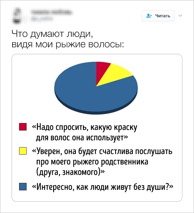 Social.org.ua зібрав найпоширеніші ситуації, з якими стикаються власники вогняного кольору волосся, і переконався в тому, що нудьгувати рудим людям точно не доводиться.