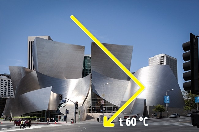 Цей комплекс був побудований з вигнутих металевих рам, які ефективно захищали зал від спеки і одночасно «підсмажували» мешканців сусідніх будинків. Сонце настільки добре відбивалося від каркасу, що плавило облицювання магазинів і нагрівало асфальт до 60 градусів.