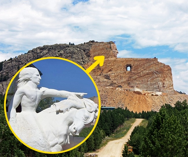 Ця найбільша в світі скульптура знаходиться на Чорних Пагорбах, в штаті Південна Дакота. За легендою, індіанця по кличці Скажений Кінь запитали загарбники: «Ну і де тепер твої землі?» Індіанець з сумом вказав пальцем на горизонт і гордо відповів: «Мої землі там, де поховані мої предки».