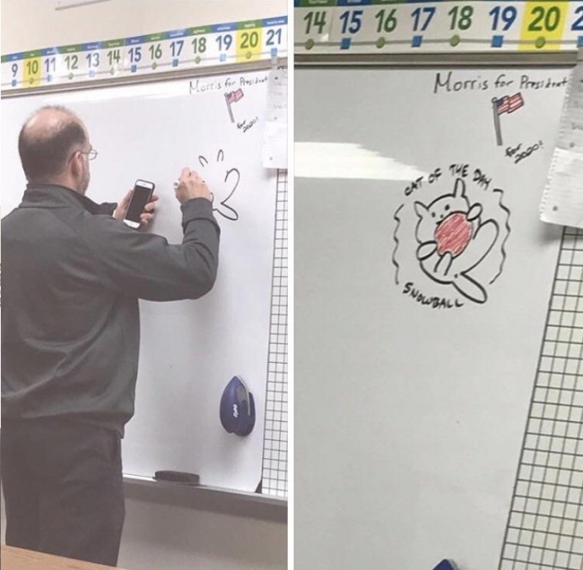 Кожен день мій однокурсник малює на дошці котика дня. А сьогодні він захворів. Учитель просто дістав телефон і почав змальовувати кота з інтернету. Обожнюю цього хлопця.