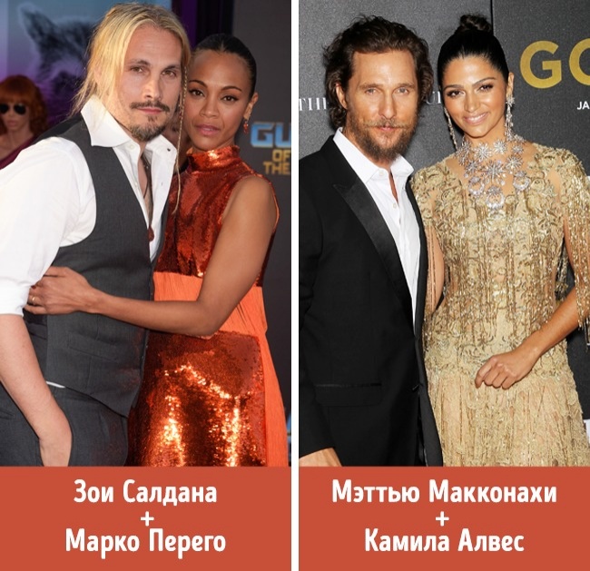Меттью Макконахі і Каміла Алвес. Меттью обідав у ресторані і звернув увагу на спекотну бразилійку, отмечавшую день народження. Актор не міг не запросити красуню на побачення, а та не наважилася відмовити красивому американцеві. Роман закрутився миттєво, а через 5 років Каміла сама зробила пропозицію Меттью. На даний момент у 3 пари прекрасних дітей.