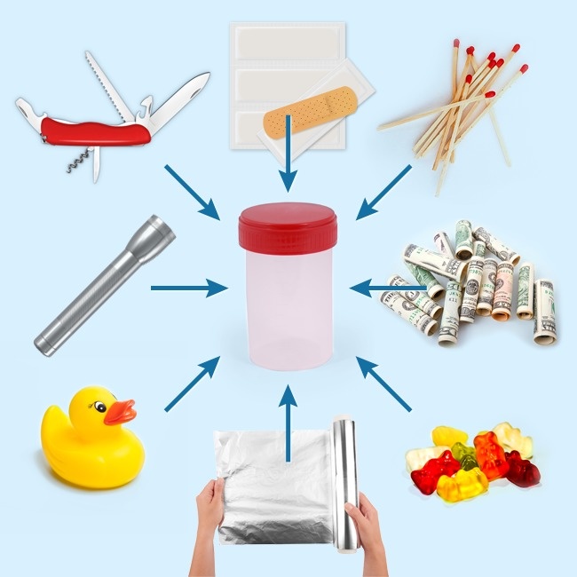 Наша мета — зробити так, щоб необхідні у випадку форс-мажору речі займали мінімум місця і при цьому зберігали форму. Ідеально для цього підійде контейнер для збору аналізів, що продається в будь-якій аптеці.