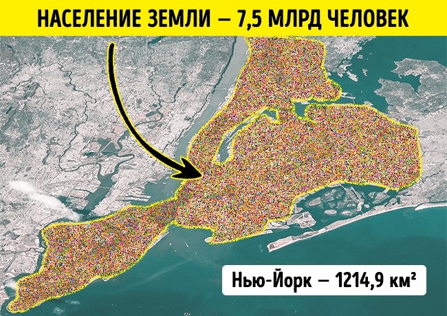 Для чистоти мисленого експерименту зберемо всіх людей в одному місці, наприклад, на клаптику Землі площею 1 тис. кв. км, розміром з Нью-Йорк. І так, уявіть собі, ми всі там помістимося.
