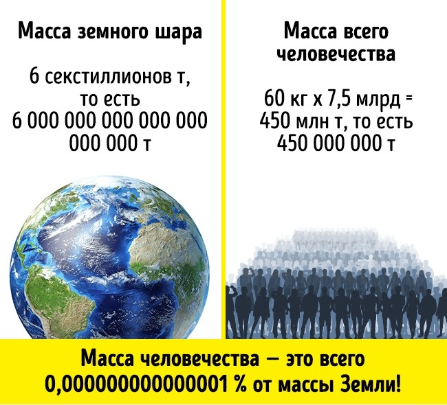 - На Землі проживає 7,5 млрд людей. Виходить, загальна маса людства — близько 450 млн т.