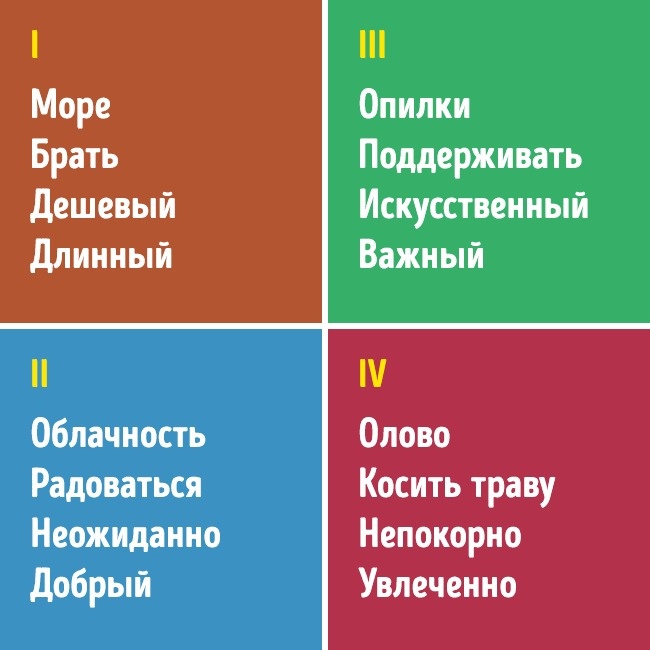 За кожне слово I групи, з перекладом якого труднощів не виникне, ви отримуєте 1 бал, з ІІ — 2 бали, з III — 3 бали, з IV — 4 бали.