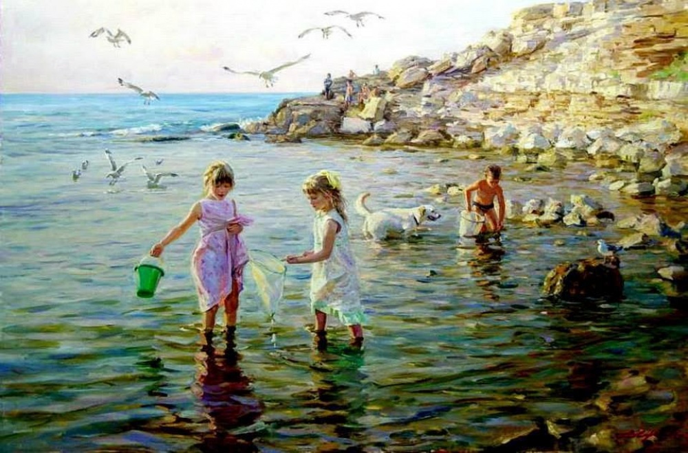 Що може бути краще, ніж літо, яке провів на березі річки чи моря? Звичайно, нічого! І в цьому абсолютно переконаний художник Олександр Аверін. На його картинах немає і тіні похмурості, а тільки спокій і радість. Тільки берег, ласкаве літнє сонце і безтурботно грають на узбережжі діти. Дуже добрі полотна.