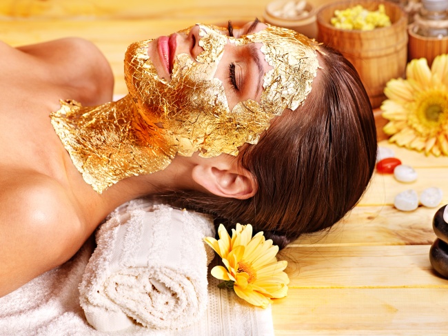Маска золота в прямому сенсі: на шкіру наносяться тонкі листи сусального золота. Цей метал насичує шкіру іонами, що покращує мікроциркуляцію і прискорює синтез колагену.