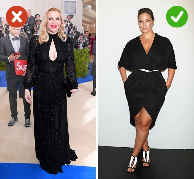 Насправді: Чорний колір йде далеко не всім і сам по собі не здатний приховати зайві кілограми. Зробити фігуру візуально стрункішою допомагає не чорний одяг, а правильно підібраний фасон.