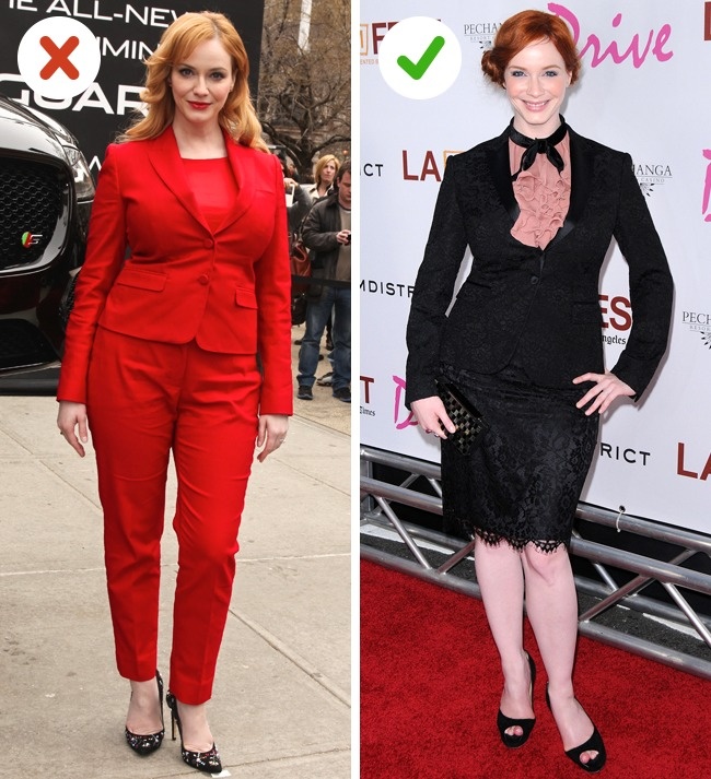 Віддайте перевагу багатошарового образом і подовженому жакету. Це візуально робить стрункішою і вище. І зверніть увагу на розташування гудзиків — вони повинні бути в один ряд. Один ряд гудзиків на сорочці або жакеті стрункішою.